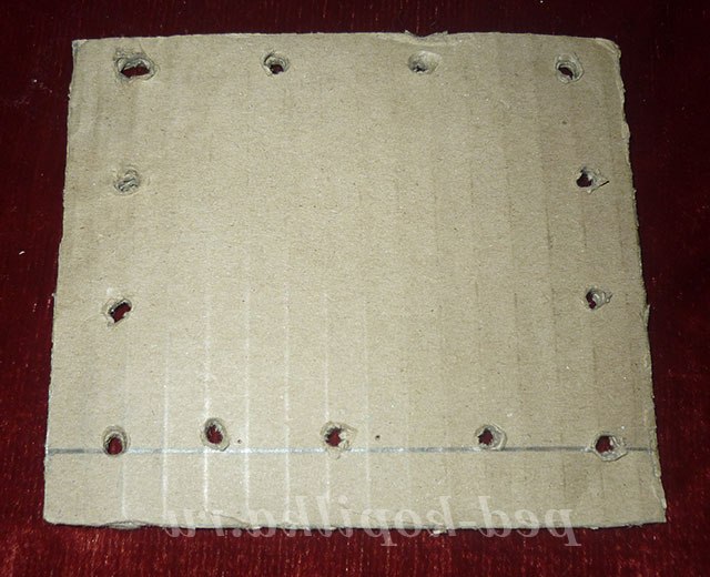 2. Вирізаємо з гофрокартону два прямокутника зі сторонами 9 і 12 см, проколюємо в одному з них дірочки. На сторонах де буде отвір для пакетиків і парканчик отвори треба зробити трохи далі від краю. Кількість їх має бути непарна.