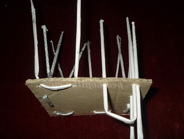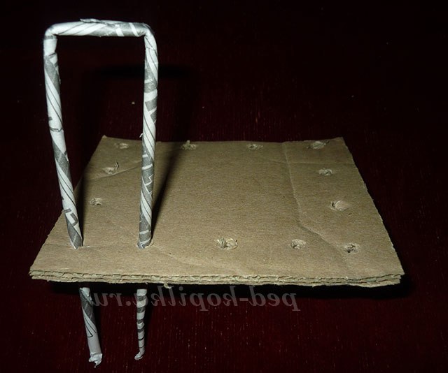 3. Згинаємо трубочки як на фото і протягуємо кожну половинку в заздалегідь приготовлену дірочку. Останнім отвір (воно повинно бути виділено) вставляється відразу дві половинки. Одна з них буде робочою трубочкою, якої ми почнемо плетіння. Коли трубочка закінчується ми нарощуємо її, вставляючи іншу протилежним кінцем (вузьку сторону в широку і навпаки)