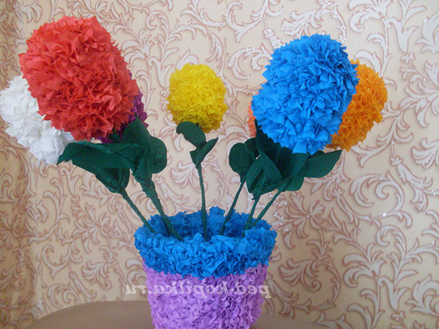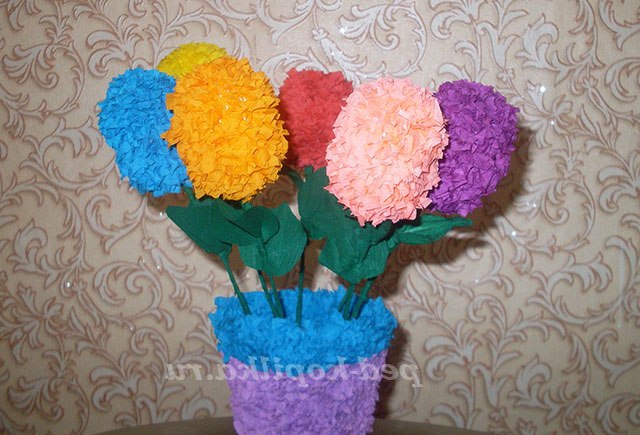 Отриманий букет можна поставити в будь-яку вазу, але я виконала її в тій самій техніці, що й квіти. В основу вази я взяла невеликий горщик, обклеїла папером і проторцевала.