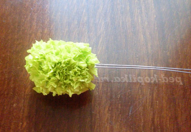 Тепер приступаємо до виконання стебла. А для цього відріжемо невелику смужку гофрованого паперу зеленого кольору, нанесемо на неї тонким шаром клей і накручуємо на стебло-дріт.