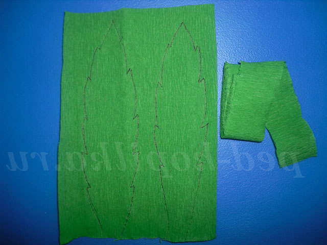 6. На гофрованої зеленої папері намалювати листочки. Зрізати смужку шириною 2 див.