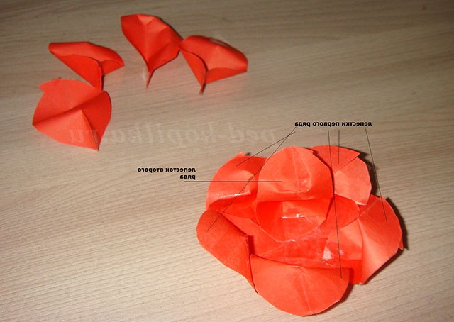 10. Наступні п'ять пелюсток утворюють другий ряд. Для цього пелюстки прикріплюємо між пелюстками першого ряду.