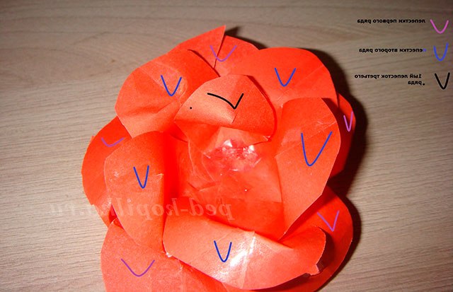 11. Решта п'ять пелюсток утворюють третій ряд - серцевину квітки. Їх маємо між пелюстками другого ряду, тобто всі пелюстки розташовані в шаховому порядку.