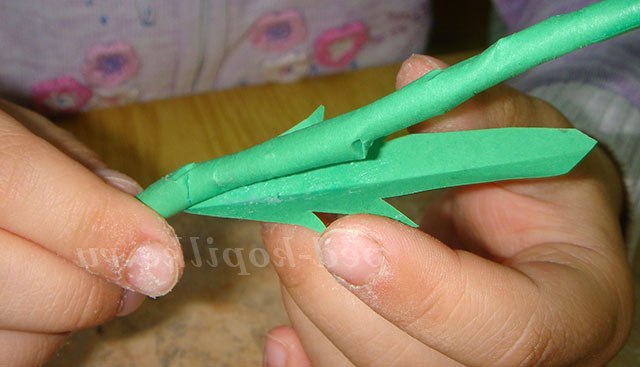 На край стеблинки, де повинна бути головка квітки, наносимо клей. І накручуємо на цей край смужку зеленого паперу, так, щоб її край виходив за межі стебла.