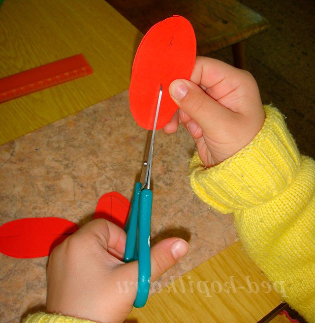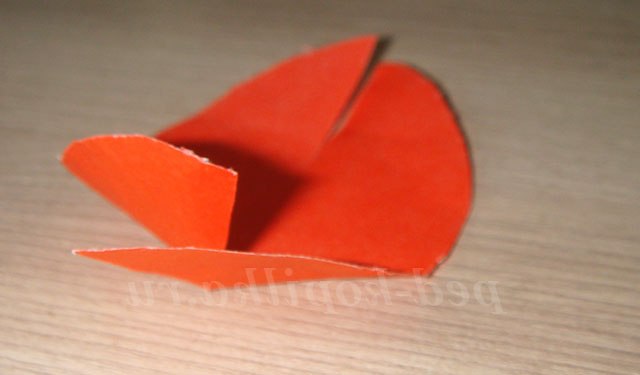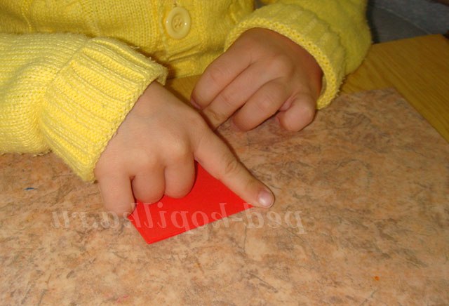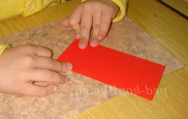 2. Приступимо до виготовлення пелюсток. Смужки паперу червоного кольору складаємо удвічі, поки не вийде 8 прямокутників.