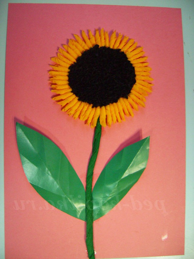10. З гофрованого паперу зеленого кольору вирізати смужку паперу шириною 10 див Скрутити смужку-це стебло квітки. Приклеїти стебло. Зайве відрізати. Потім за шаблоном вирізати листочки.