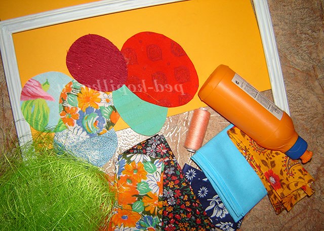 Обладнання: різнокольорові клапті тканини в народному стилі, ножиці, голки, нитки, клей універсальний, рамка, картон для фону, фарби акрилові для тканини, сизаль зеленого кольору.