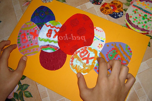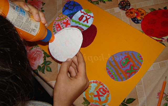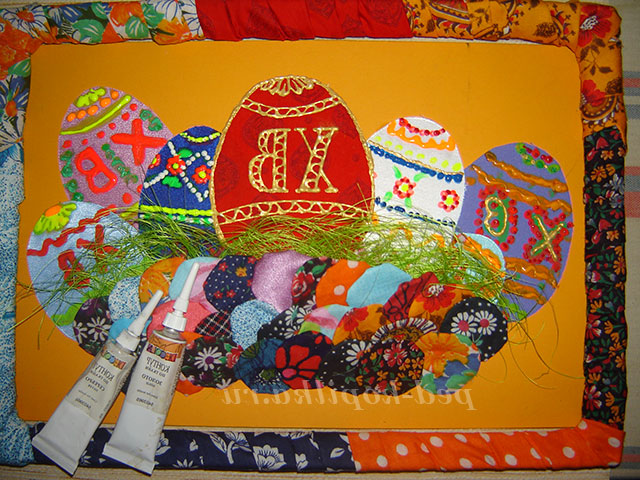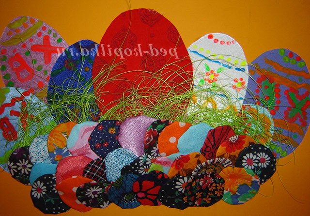 Беремо картон для фону і розкладаємо заготовки тканинних яєць в єдину композицію.