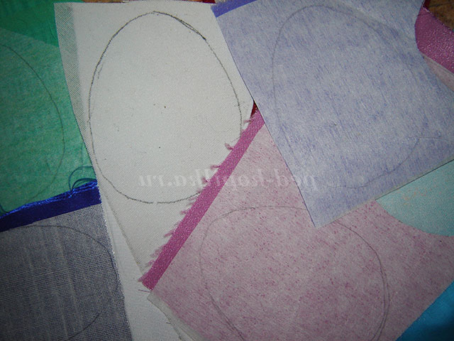 Відрізаємо ножицями шматки розміром 10х10см. Наклеюємо флізелін з одного боку тканини. Простим олівцем намічаємо контури яєць.