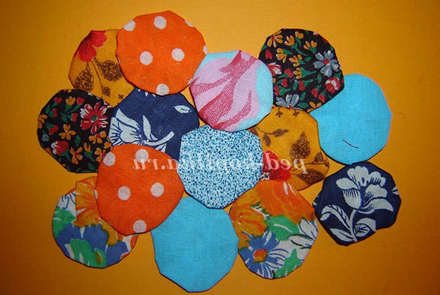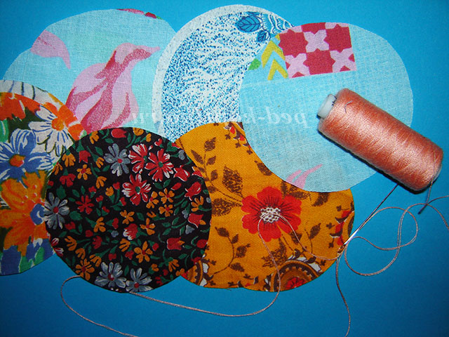 З решти клаптиків тканини (без флізеліну) вирізаємо кружечки діаметром 9-10 див.