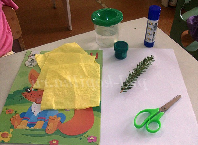 1. Нам знадобиться: альбомний аркуш, ножиці, клей, серветки жовтого кольору, кольоровий папір, зелена гуаш, тарілка, гілочка ялини.