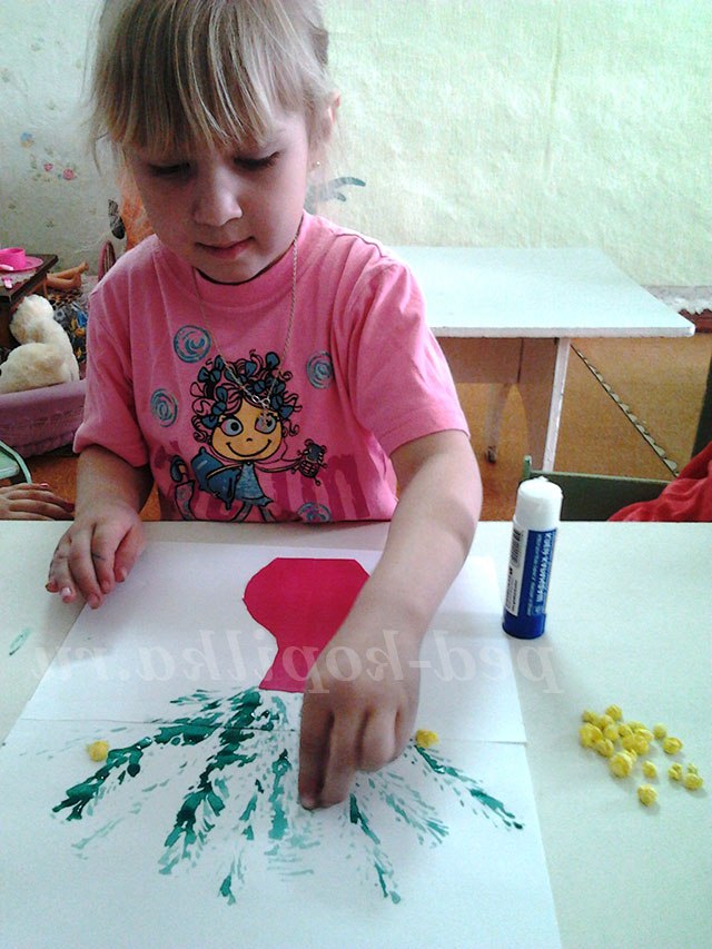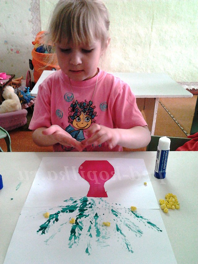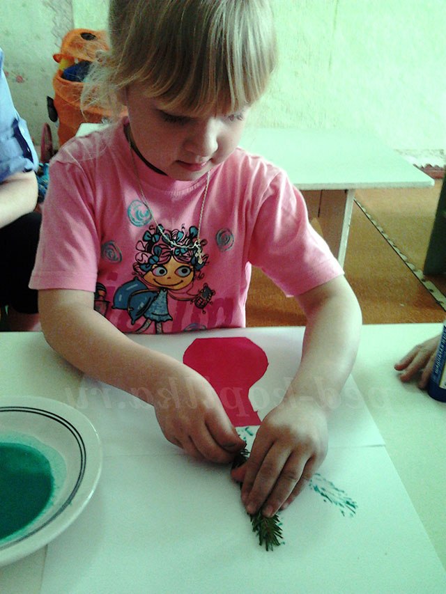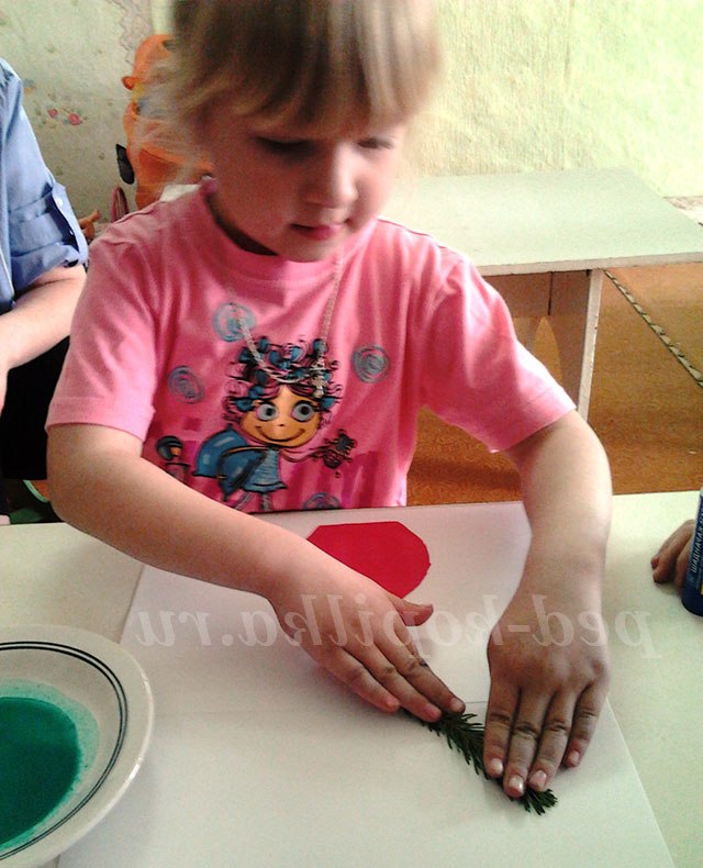 5. Потім прикладаємо гілочку ялини до альбомному аркуші , як ніби у вазі стоять гілочки.