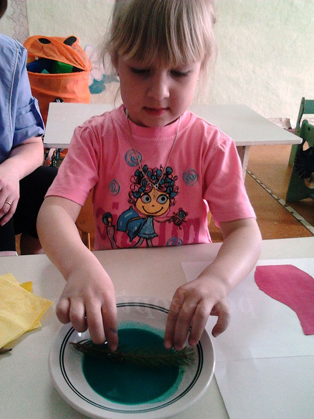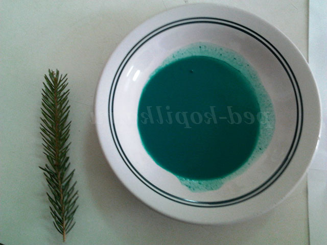 4. У тарілці розводимо гуаш з водою і опускаємо туди гілочку ялини.
