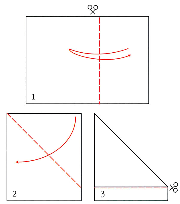 1. Складіть аркуш паперу довільним чином, але так, щоб одна частина була більше іншої, а потім розріжте по наміченій лінії.