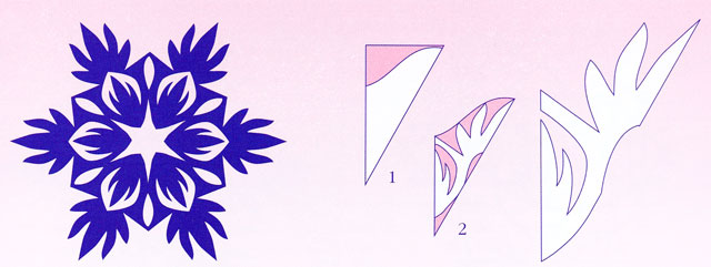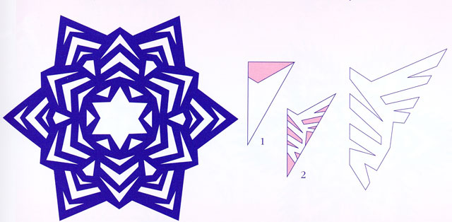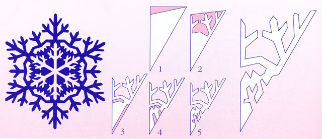 Процес виготовлення кожної сніжинки складається з 3-5 послідовних схем, на яких чорним кольором позначені видаляються ділянки паперу. Остання схема, на якій показана повністю вирізана, але ще не розгорнута, сніжинка, одночасно є і шаблоном. Ви можете «на око» змалювати з неї візерунок на свою заготовку або ж перевести його за допомогою кальки і копіювального паперу.