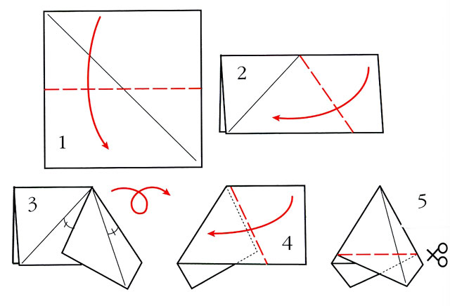 Всі представлені сніжинки ми будемо вирізати з цього опису, починаючи з пункту 2, коли правильний трикутник вже складений навпіл. Справа в тому, що вирізаються всі сніжинки однаково, змінюється лише візерунок, тому ми не стали повторювати опис роботи багато разів, а обмежилися лише точними схемами.