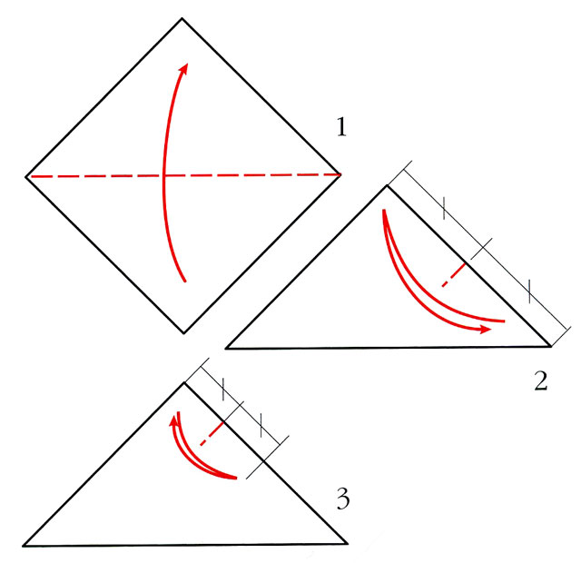 2. Потім складіть аркуш «на око» так, щоб кути, зазначені на схемі 3 були рівні.