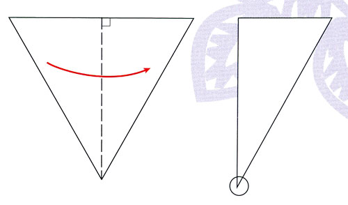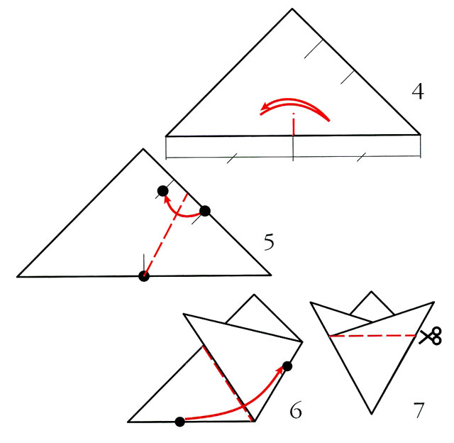 1. Отриманий одним із запропонованих вище способів правильний трикутник (у розгорнутому вигляді шестикутник) складіть навпіл. Всі дії виконуйте дуже точно, щоб потім ножицями не прорізати складені криво шари паперу. Прослідкуйте, щоб обведена в гурток маківка (див. схему) опинилася в центрі майбутньої сніжинки.