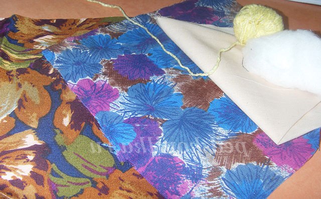 Квадратні шматки спідниці складаємо трикутником,моместив в середину по шматочку вати.