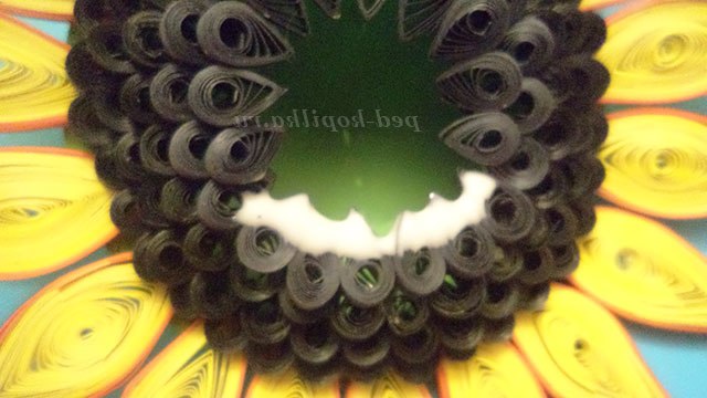 Коли композиція підсохла, перевертаємо її і в завершенні у середину насіння (там ми ще не доробили), приклеюємо тугий рол чорного кольору.