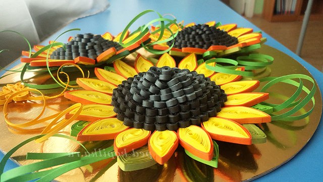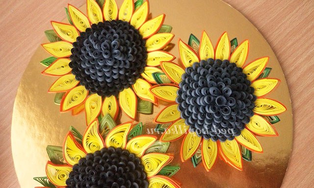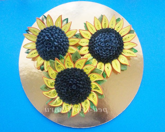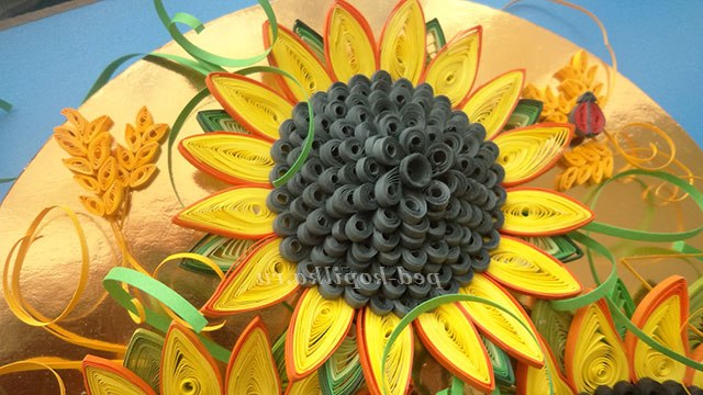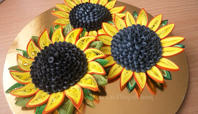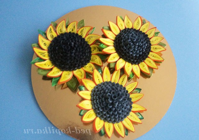 Виготовлення 3 соняшнику відбувається аналогічним чином. Пелюсточки - «Вигнутий око», листочки - «Крапля». Листочки чергувала болотного відтінку з листочками 2-го відтінку. Насіння - «Крапельки», але зробила 2-х відтінків. Спочатку 3 ряду - чорні, до середини - 5 рядів графітового відтінку.