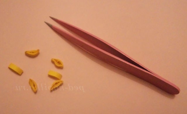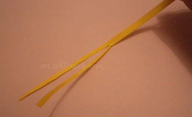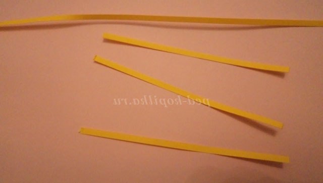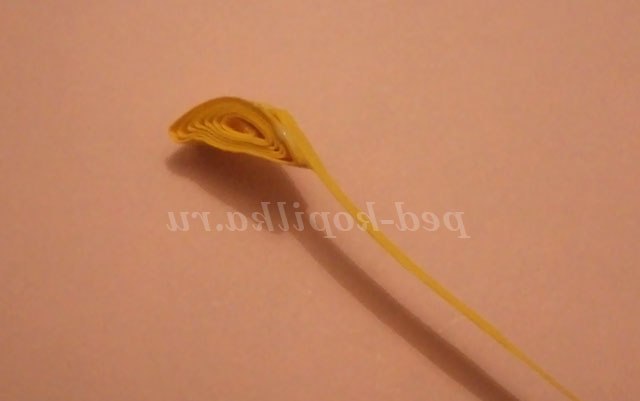 Для виготовлення пелюсточок другого соняшника я використовувала паперові смужки відтінку «Лимон» і помаранчевий. Пелюстки виготовляла у формі «Вигнутий очей».