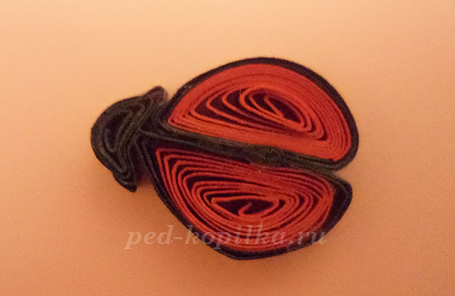 Ну і звичайно не обійшлося без маленької комашки-сонечка. Я склеїла червону і чорну смужки, накрутила починаючи з червоного кінця, надала їм форму, аналогічну зернышкам колосочків, і склеїла їх разом поруч. Зверху з чорної смужки, форма та ж, зробила і приклеїла голівку. Вийшла така корівка.