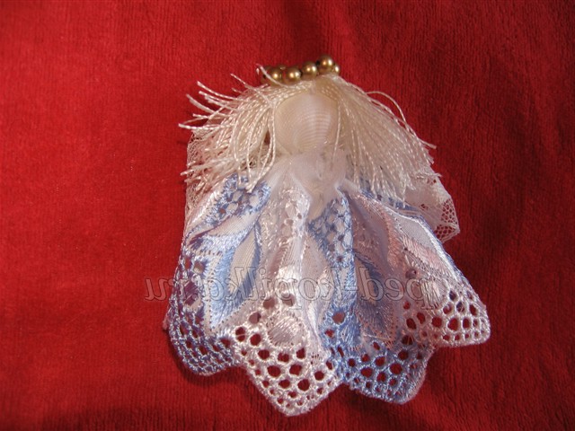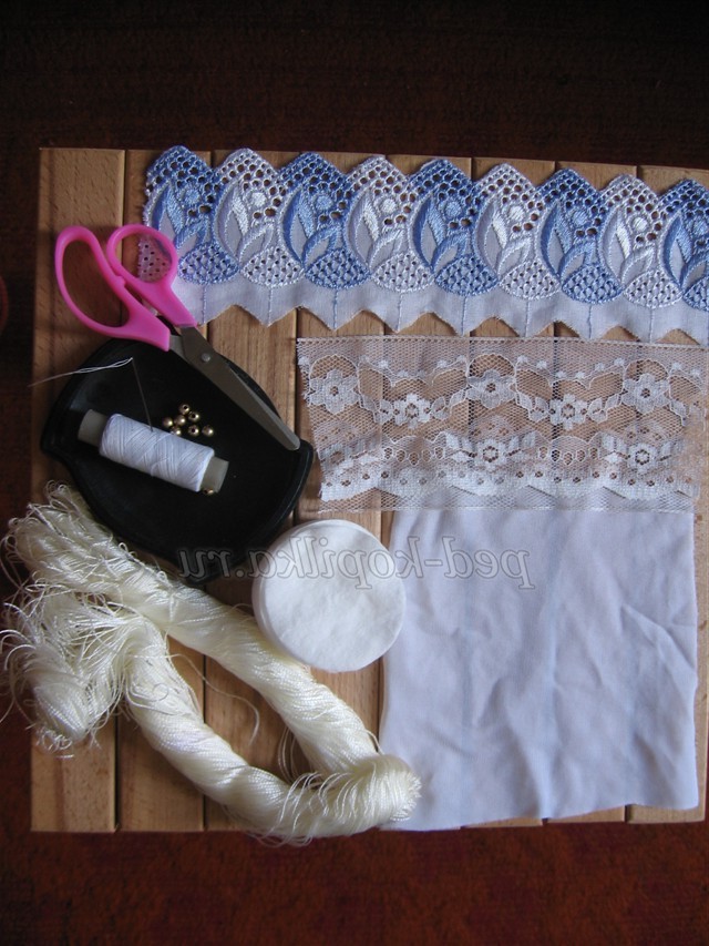 Обладнання: біла тканина 12х12см, мереживо 15-18 см, прозоре мереживо 10-12см, білі нитки, голка, ножиці, вата, золотистий бісер 8-10 штук, пучок ниток шовкових для волосся діаметром 0,8см і 6см. довжиною (можна замінити на будь-які).