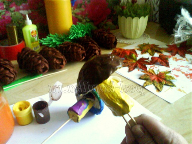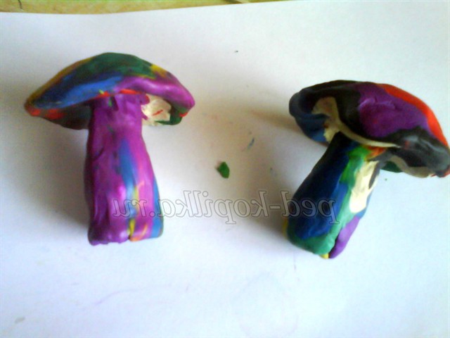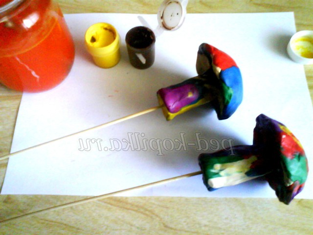 Далі робимо гриби з пластиліну, можна використовувати будь-який колір, ми його все одно закрасимо