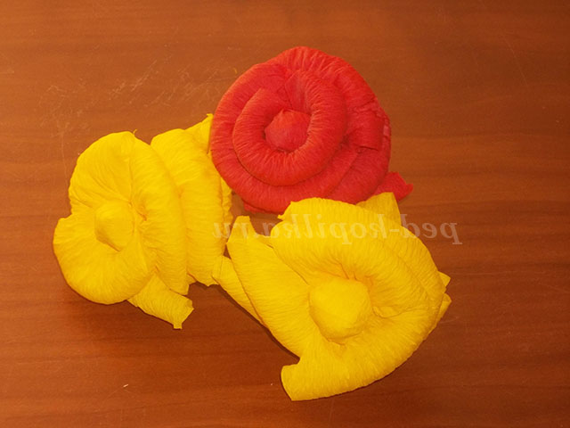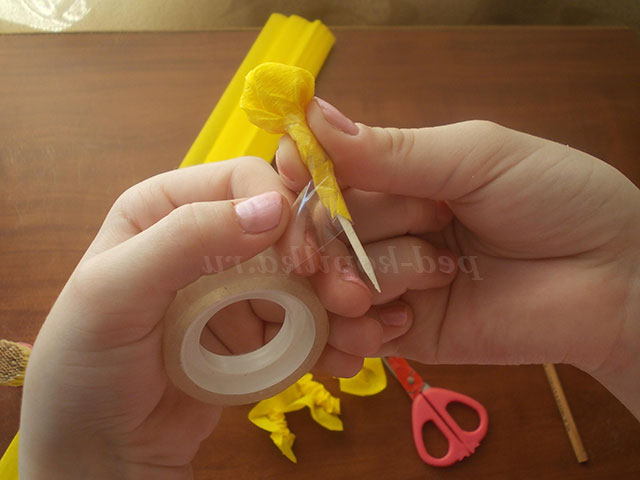 Щоб зробити серединку, треба взяти квадратик і в серединку вкласти кульку з гофрованого паперу і вставити зубочистку, закріпити навколо палички скотчем.