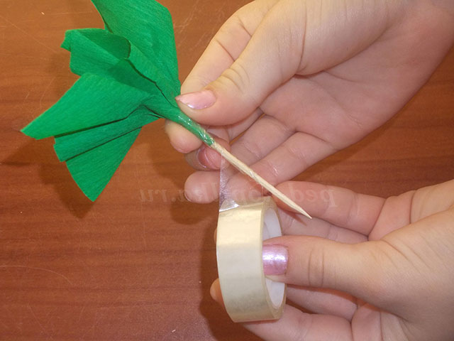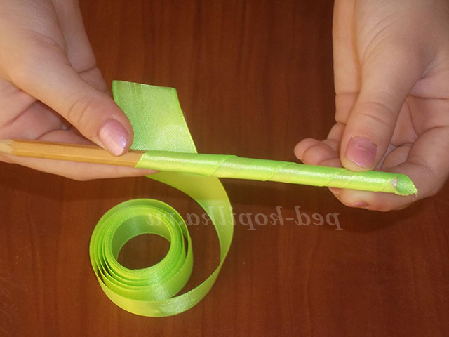 Беремо олівець або паличку, обклеюємо подвійним скотчем і обмотуємо атласною стрічкою (я використовувала світло-зелену стрічку, а можна і коричневого кольору).