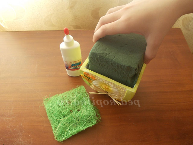Беремо флористичну губку. Вирізаємо губку потрібних розмірів, щоб вона увійшла в кашпо і вставляємо її.