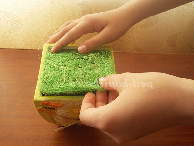 Вирізаємо ножицями квадратик з сизалю і приклеюємо на клей ПВА - це у нас буде травичка.