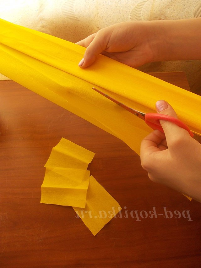 Перший етап, приступаємо до виготовлення квітів. Вирізаємо з гофрованого паперу квадратики.