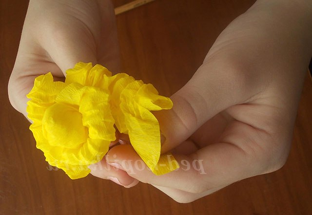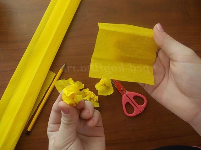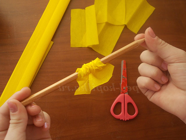 Накручуємо гофрований квадратик на олівець залишаючи знизу 1,5-2 см і стискаємо папір.