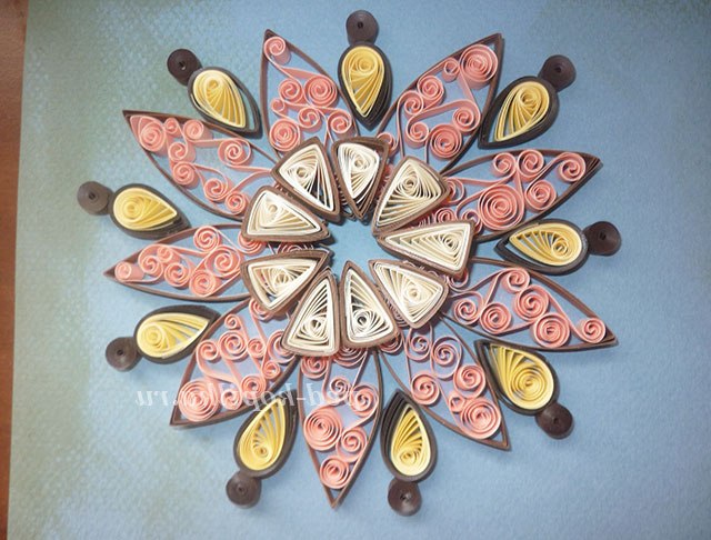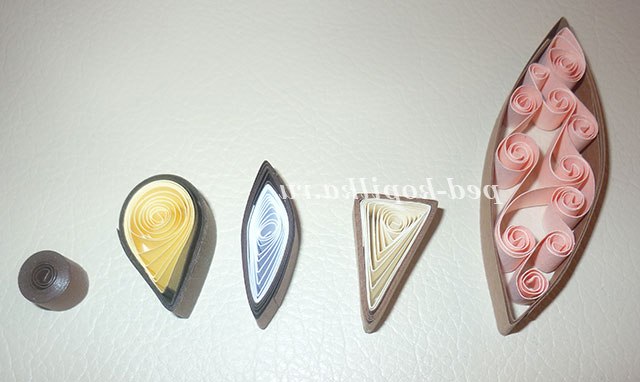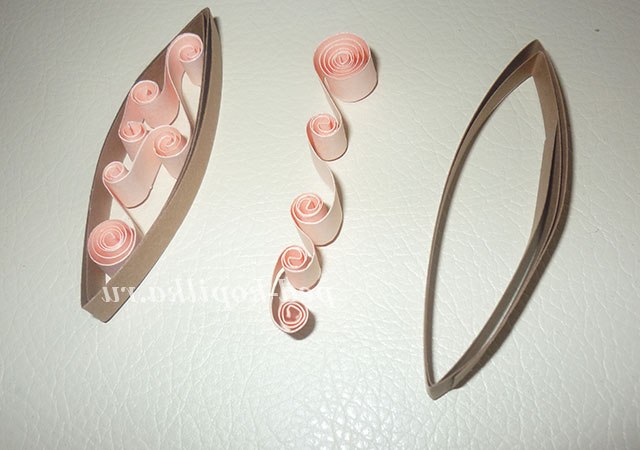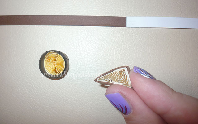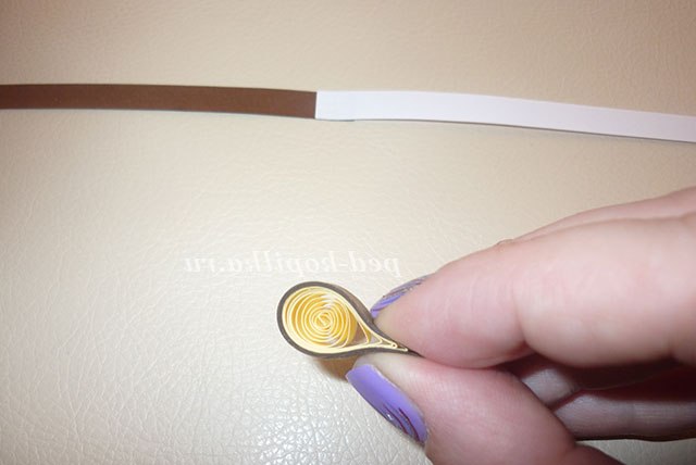 Завитки вставляємо в пелюстка. Пелюстка виготовляємо шляхом складання паперової стрічки в кілька разів. Кінчик заклеюємо. В середину вставляємо завитки.