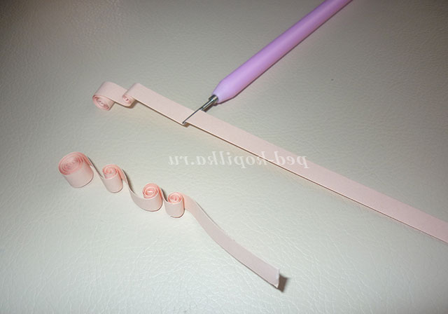 Для виготовлення ажурних пелюсток в центрі квітки, нам потрібно з паперових стрічок накрутити завитки. Спочатку кінчик стрічки накручуємо на інструмент 5 оборотів, витягуємо інструмент і вставляємо нижче на