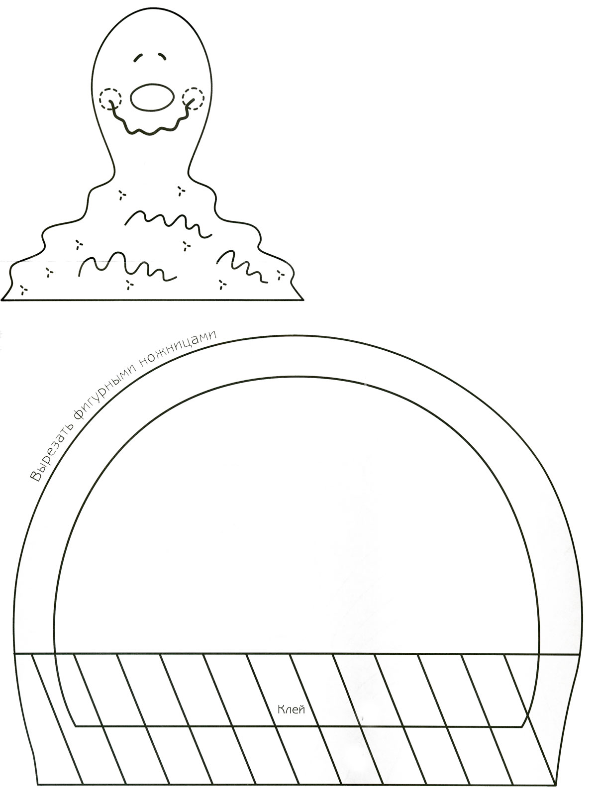 2. Переведіть викрійку тулуба равлики з допомогою простого олівця і кальки на жовтий картон. При перекладі будиночка равлика спочатку намалюйте внутрішні лінії викрійки. Півколо і пряму лінію краще всього заздалегідь розмітити простим олівцем. Виріжте будиночок, наклейте його на оранжевий картон і виріжте ще раз разом з ним. Необхідно залишити по всій окружності помаранчевого картону припуск 1 см і обробити його по периметру ножицями з зубцями. Змастіть клеєм заштрихованную на викрійці область і приклейте ззаду будиночок равлика до картону.