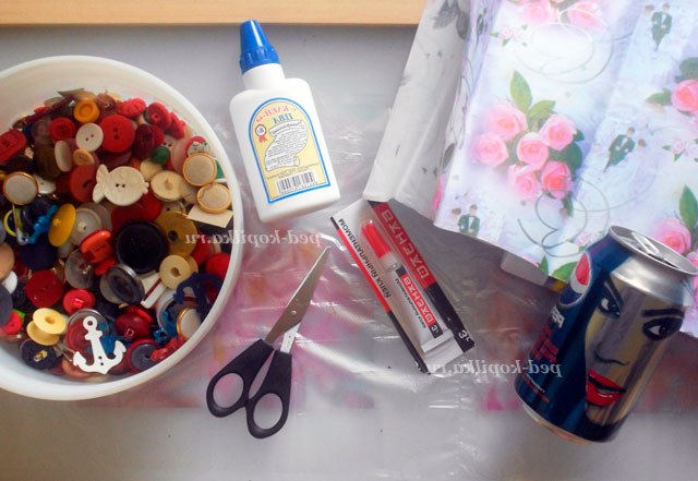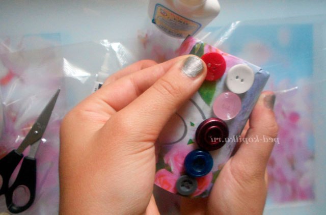 6. Скористаємося гудзиками різного кольору і розміру: прикріплюємо їх до нашої вироби, використовуючи клей момент.