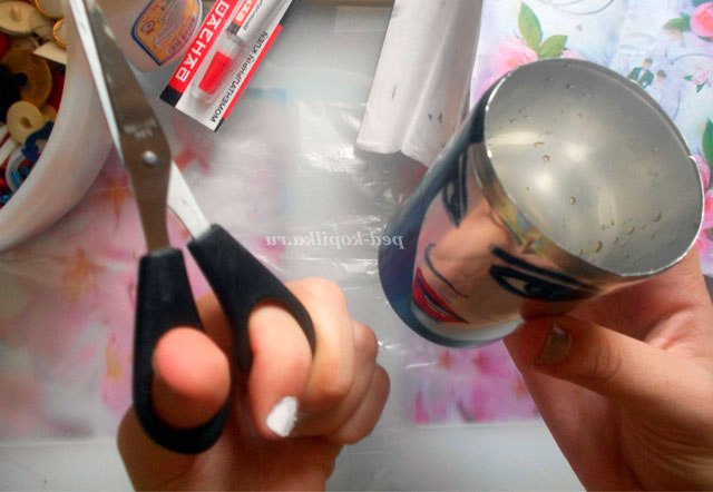 2. Обрізаємо шийку у банки по колу, акуратно користуючись ножицями.