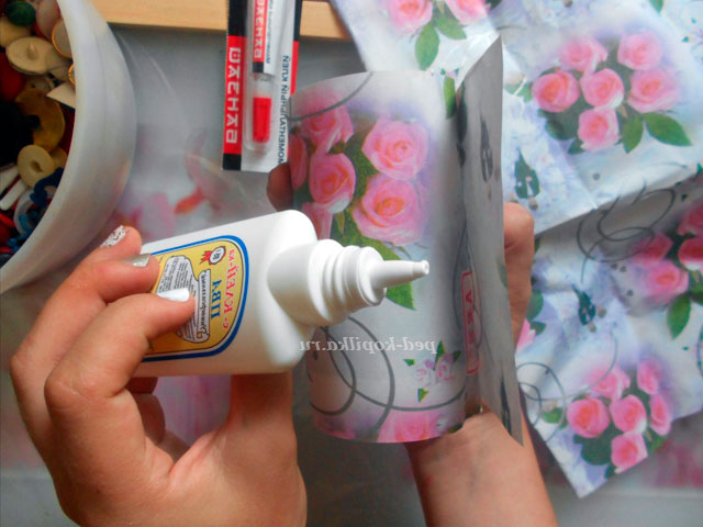 4. Обертаємо нашу банку з-під газованої води красивою папером і склеюємо її клеєм ПВА, для того що б зафіксувати.