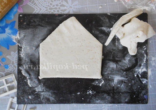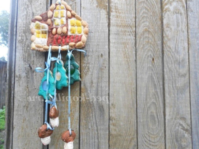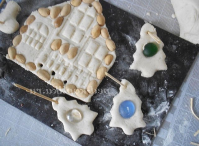 Використовуємо деталі від конструктора та шкаралупу від фісташок. У цьому випадку з тіста вирізаємо форму будинку і за допомогою деталей в тесті робимо віконця, двері і паркан.