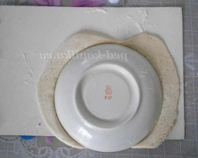 Розкачуємо тісто в пласт товщиною 4-5см. Зверху кладемо тарілку, притискаючи її до тесту, ножем вирізаємо коло
