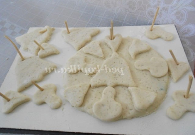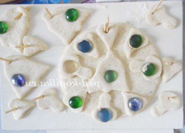 Дерев'яними шпажками робимо отвори, залишаючи їх в тесті. Прикрашаємо виріб скляними камінцями.