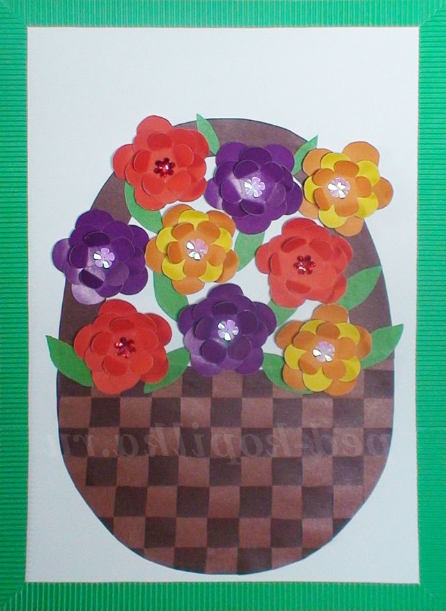 8. На аркуші форматом А-3 приклеюємо кошик з ручкою. Потім в кошик приклеюємо квіти і листочки. Вийшла цікава кошик.