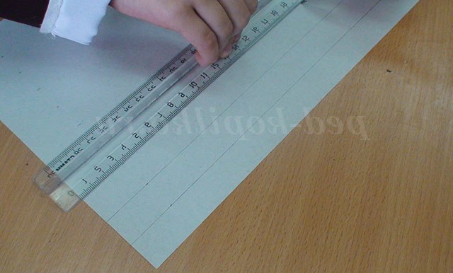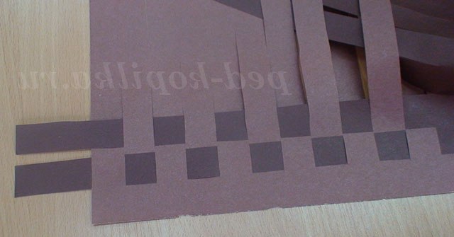4. Для виготовлення кошики беремо 2 відтінки коричневого паперу і за допомогою лінійки і олівця проводимо лінії так, щоб ширина кожної смуги була 2 див. Світло-коричневу папір разлиновываем по ширині, а темно-коричневу - по довжині (можна і навпаки).