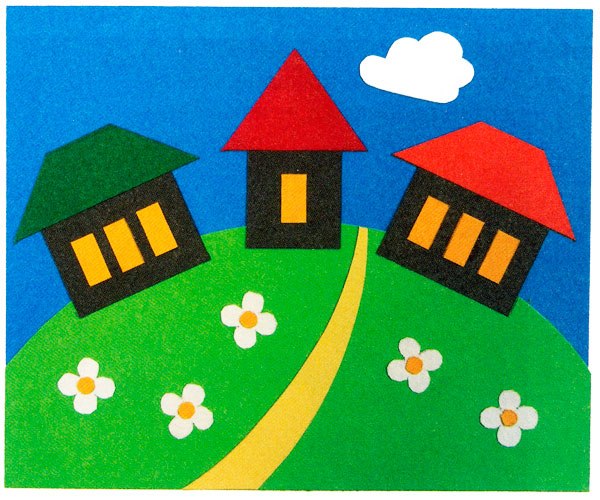 2. Виріжте з зеленого паперу «землю», з жовтою - доріжку, а з коричневої - 3 квадратика-будиночка.