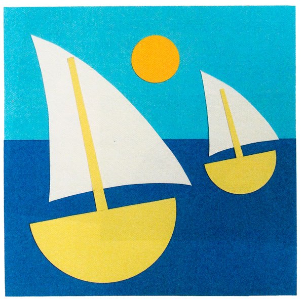 4. Склейте вітрила з щоглами, приклейте на фон човники: велика - ближче, маленька - далі, в центрі - сонечко.