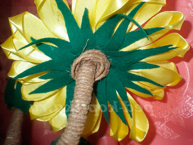 Вирізаємо з зеленого драпу листя і наклеюємо на паростки стебел.