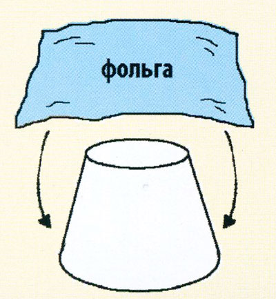 в) Зробіть шапочку-відро. Для цього основу для шапочки (картонну клітинку) оберніть фольгою.